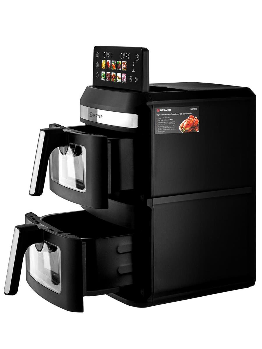 Объем верхней чаши 6,5 л. Объем нижней чаши 6,5 л. 0 программ: фри, курица, рыба, мясо, пицца, овощи, крылья, морепродукты, кекс, разморозка