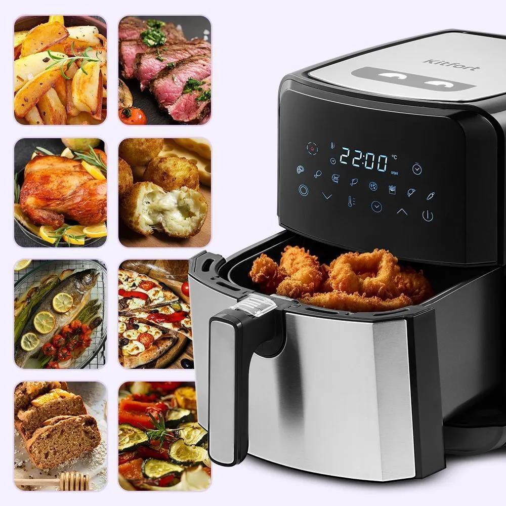 Стильный и компактный аэрогриль Kitfort КТ-2239 может использоваться как аэрогриль, а также как аэрофритюрница, духовка и сушилка и позволяет готовить большинство продуктов с минимальным количеством масла или вовсе без его добавления.