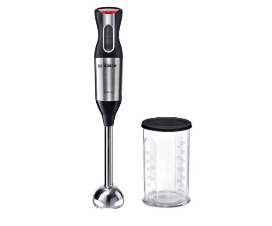Простая готовка с Bosch ErgoMixx Style: максимальная мощность. Оптимальный комфорт. Максимальная мощность мотора 1000 Вт: для переработки даже твердых ингредиентов и для эффективной работы всех насадок. Quattro Blade технология: инновационный нож с 4 острыми лезвиями для получения идеальных результатов Эргономичная форма и стильный дизайн: корпус из нержавеющей стали с мягкой ручкой. 12 настроек скорости плюс функция Турбо для получения идеальной консистенции для любого рецепта. Стакан с крышкой: для измерения объема жидких и сыпучих продуков, смешивания и хранения продуктов.