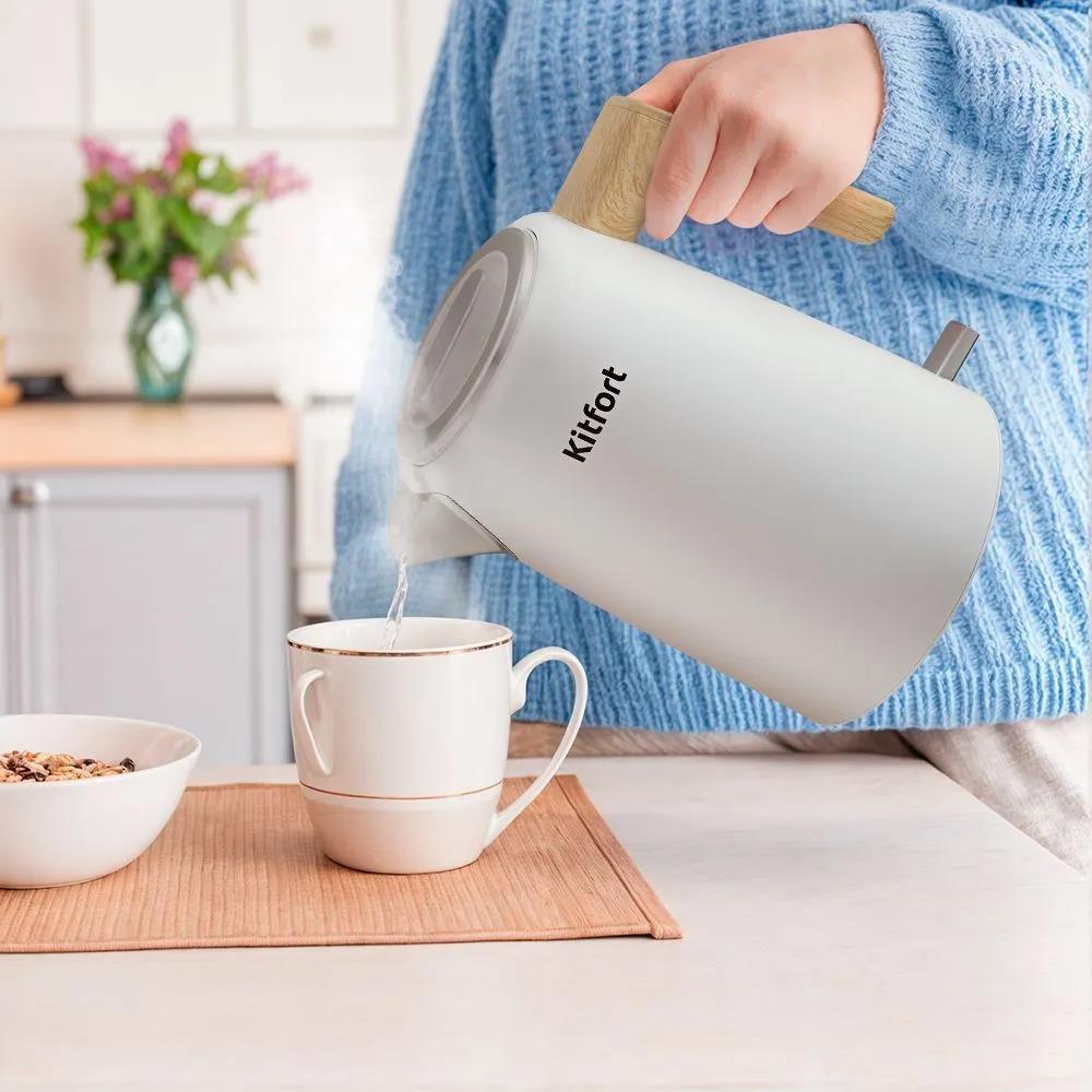 Электрический чайник Kitfort КТ-6794 (2200 Вт/1,7 л /нержавеющая сталь, дерево/белый, дерево)