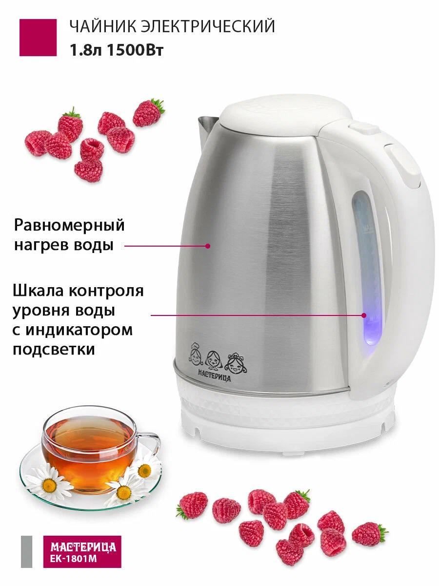 Электрический чайник Мастерица EK-1801М (1500 Вт/1,8 л /металл, пластик/белый, нержавеющая сталь) - Интернет-магазин Матрица: бытовая техника, электроника, товары для дома и др.