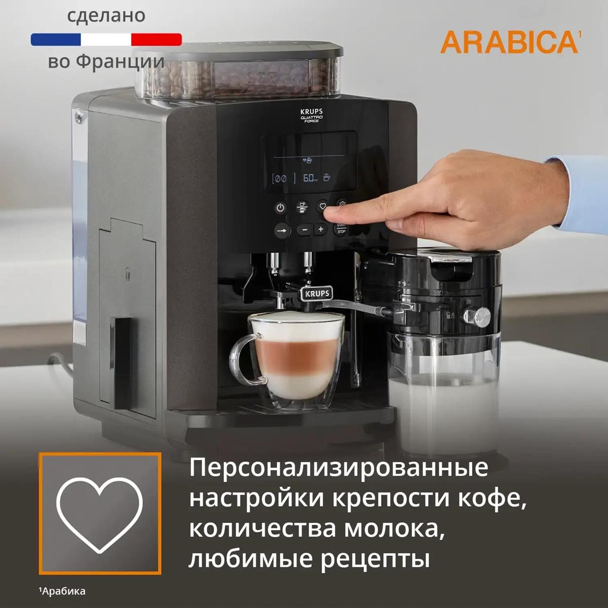 Автоматическая кофемашина KRUPS Arabica Latte позволит вам наслаждаться потрясающе вкусными и ароматными кофейными напитками у себя дома. Благодаря большому и удобному LCD-дисплею вы легко приготовите эспрессо или капучино одним нажатием кнопки. Три предустановленные программы для молочных напитков предназначены для создания воздушной и кремовой молочной пены по вашему вкусу, а интеллектуальная система сохранит до четырех ваших любимых рецептов. Кофемашину просто чистить – резервуар для воды легко снимается, а капучинатор быстро разбирается на три части. В дополнение ко всему инновационная технология KRUPS Quattro Force поможет добиться потрясающего вкуса и аромата в каждой чашке кофе.