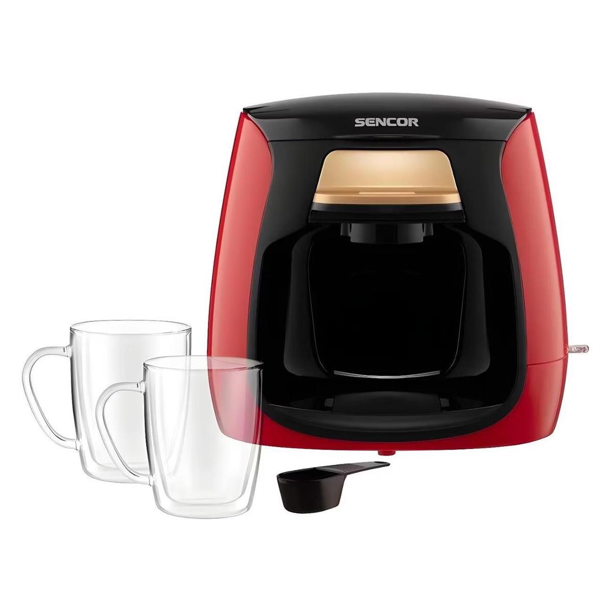 Sencor SCE 2101RD — компактный прибор для одновременного приготовления двух чашек напитка из молотых зерен. Прибор укомплектован парой стеклянных кружек с двойными стенками. В устройстве можно заваривать чай. Многоразовый нейлоновый фильтр легко снимается для очистки с помощью ручки. Резервуар для воды вмещает 300 мл, указатель поможет контролировать наполнение. Управление обеспечивает одна кнопка со световым индикатором. По окончании приготовления машина автоматически отключается. Основание прибора снабжено противоскользящей накладкой. Размеры модели — 21,5х20,5х32,5 см, вес — 1,6 кг.