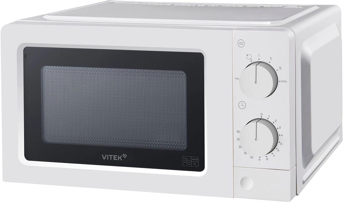 Vitek VT-MW0820 — компактная микроволновая печь для ежедневного разогрева и простой готовки. Камера объемом 20 л подходит для стандартных тарелок и форм, поэтому обед из холодильника, каша на завтрак или порция соуса прогреваются без лишних манипуляций. Мощность микроволн 700 Вт обеспечивает стабильный результат, а внутренняя подсветка позволяет видеть процесс через стеклянную дверцу, не открывая камеру и не сбивая время. Белый корпус выглядит аккуратно и уместно в светлой кухне, не перегружает интерьер и легко сочетается с другой техникой.
