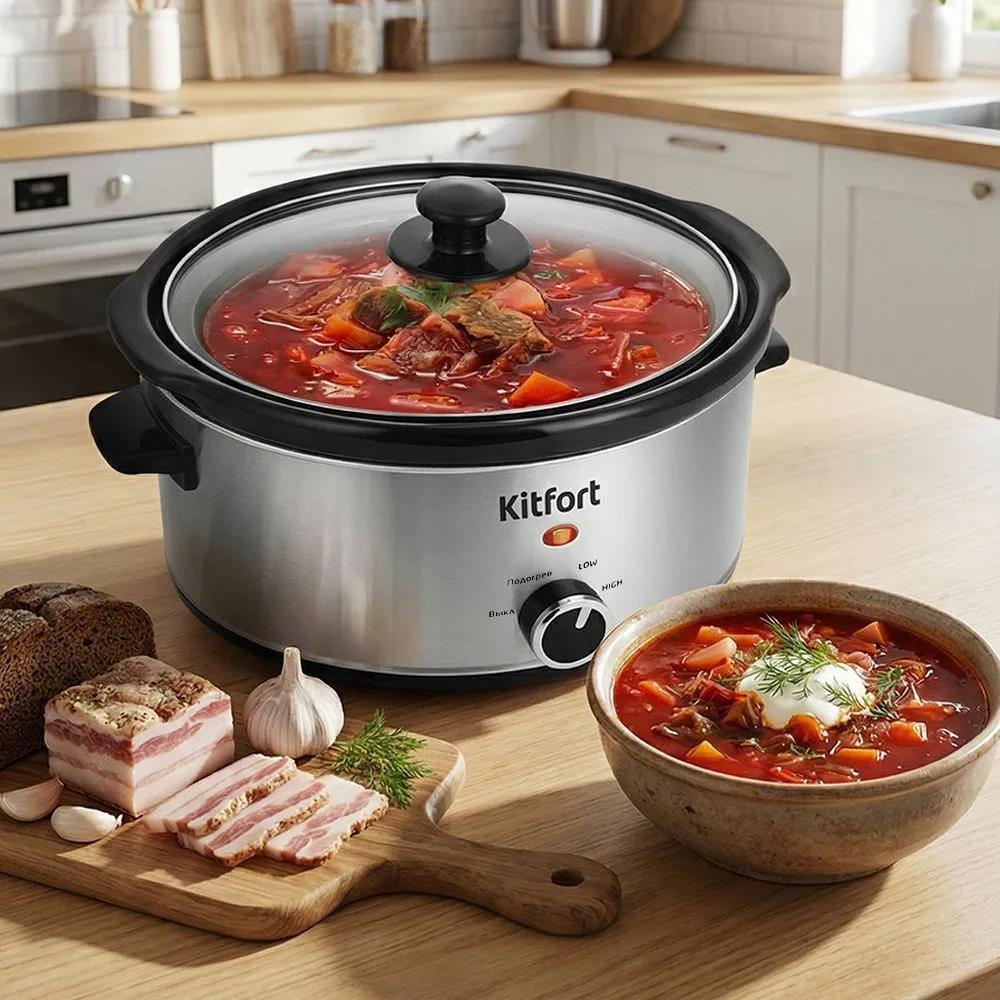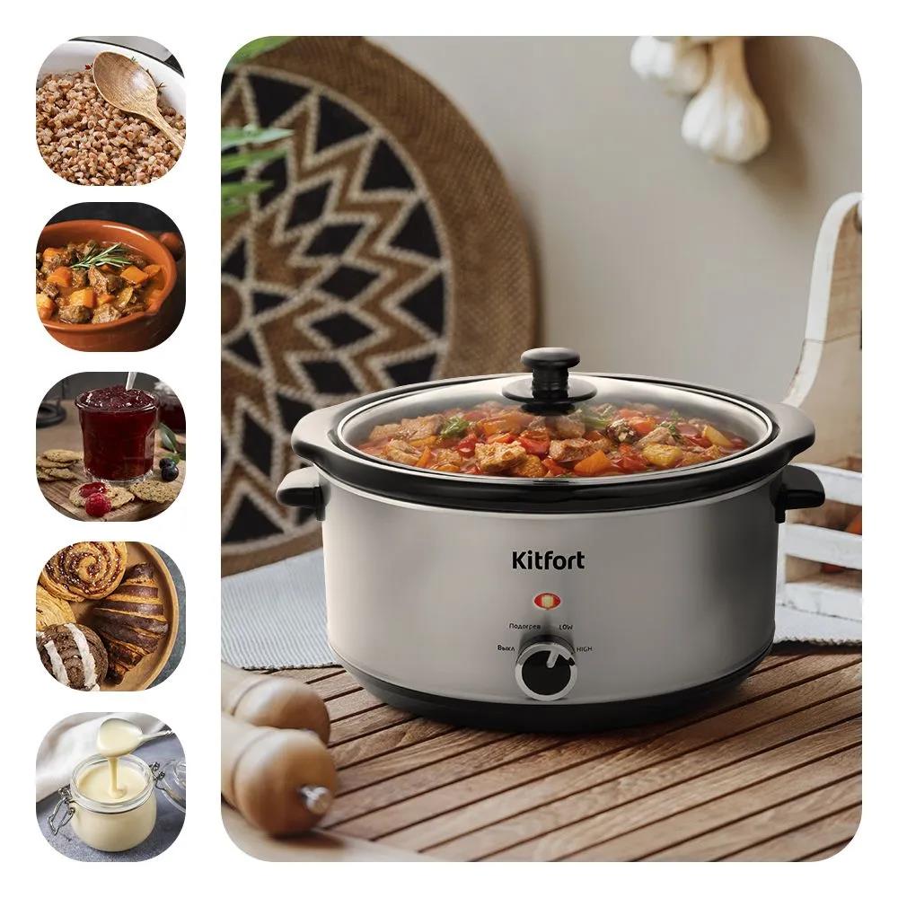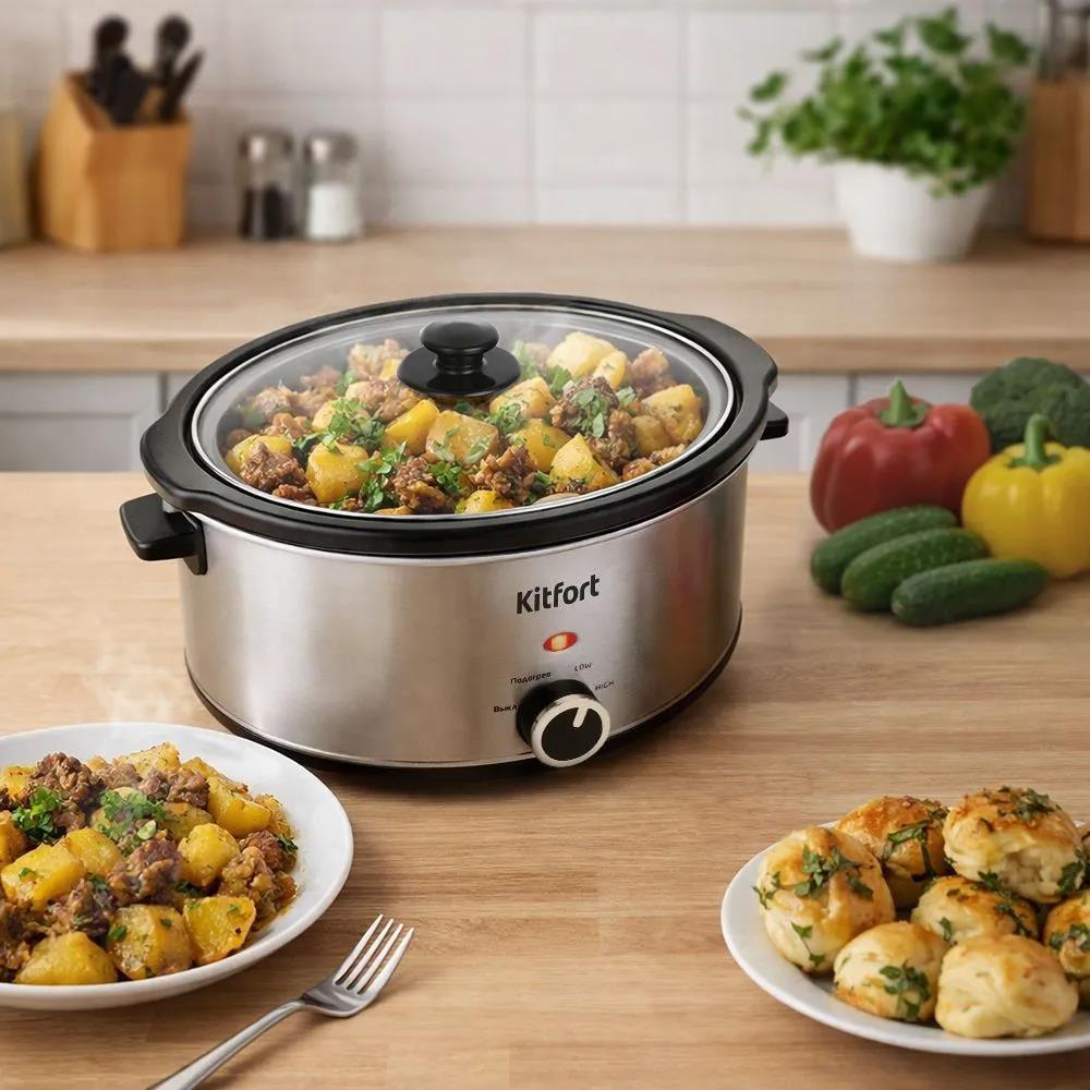 Медленноварка Kitfort КТ-208 готовит блюда особым способом – томлением. Температура лежит в диапазоне 60-120° C. Этот способ идеален для блюд длительного приготовления, как каши, рагу, жаркое, варенье, плов, выпечка, топлёное и сгущённое молоко и др. У медленноварки 2 режима работы: LOW – длительное томление 4-12 часов, HIGH – интенсивное приготовление от 3 до 8 часов. Также у медленноварки есть режим подогрева уже готовой пищи.