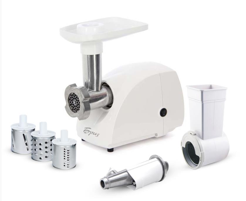 В комплекте - решётка с диаметром отверстий 4.9 мм; пластиковый колпачок -1 шт; приставка овощерезка с 3 барабанами (крупная, мелкая терка и шинковка); приставка соковыжималка.