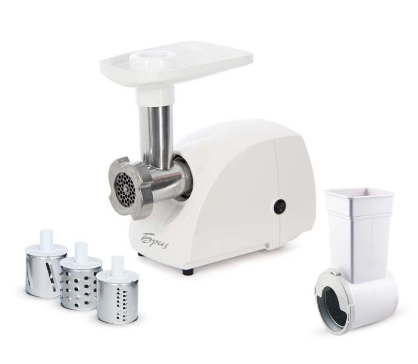 В комплекте - решётка с диаметром отверстий 4,9 мм; пластиковый колпачок -1 шт; приставка овощерезка с 3 барабанами (крупная, мелкая терка и шинковка)