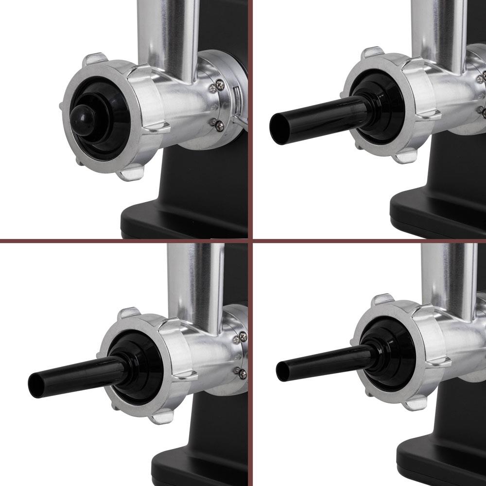ENDEVER SIGMA-113 может перерабатывать до 3 кг мяса в минуту. Широкое выводящее отверстие 65 мм обеспечивает лучшую проходимость продуктов. А функция реверса позволяет освободить устройство от застрявшего мяса, жил и беспрепятственно продолжить работу. Мясорубка оснащена тремя решетками с отверстиями: двумя с диаметром 4 мм и 7 мм и одной с 10 отверстиями. Так, вы сможете регулировать помол фарша. С этой мясорубкой вы сможете порадовать близких вкусными домашними кеббе и колбасами — в комплект мясорубки входят специальные насадки для этого. Наличие разнообразных решеток дает возможность не ограничиваться изготовлением только лишь мясного фарша. С их помощью вы сможете перерабатывать также овощи, ягоды и другие продукты. Надежную работу устройства при сильных нагрузках обеспечивает защита от перегрева, кованый стальной нож и металлический загрузочный лоток. Нескользящие прорезиненные ножки позволяют мясорубке быть устойчивой при работе. Мясорубка имеет оптимальный уровень шума ≤85 дБ и средний вес — около 5 кг вместе с аксессуарами.