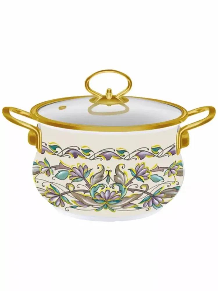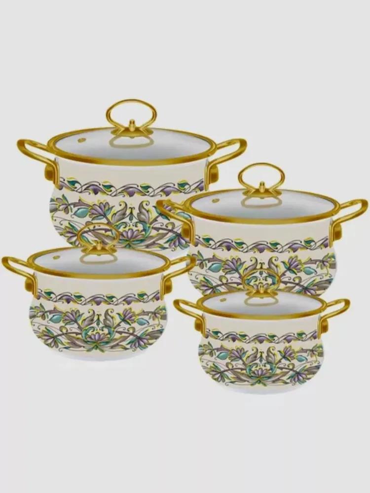 8 предметов: 4 эмалированные кастрюли, 4 стеклянные крышки. Размеры: Ø 20 | h-13.0 см | 3.0 л, Ø 22 | h-14.2 см | 4.5 л, Ø 24 | h-15.0 см | 5.5 л, Ø 26 | h-16.0 см | 6.5 л