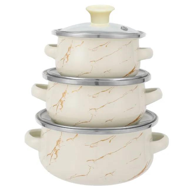 6 предметов Кастрюля с жаропрочной стеклянной крышкой 0.5л Кастрюля с жаропрочной стеклянной крышкой 0.7л Кастрюля с жаропрочной стеклянной крышкой 1.1л 3-х слойное внешнее эмалированное покрытие 3-х слойное внутреннее эмалированное покрытие Жаропрочные стеклянные крышки с ручками