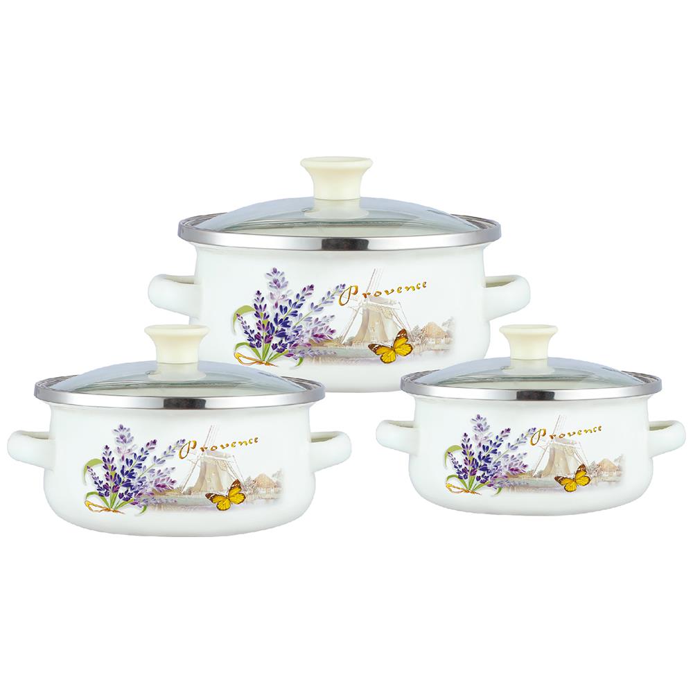 Набор мини-кастрюль, 6 предм. (3 КАСТРЮЛИ С КРЫШКАМИ: 0,5 Л (d12 см), 0.8 Л (d14 см), 1,2 Л (d16 см) с внутренним эмалированным покрытием), эмалированная сталь, внешнее покрытие - эмаль с рисунком. Подходит для индукции.