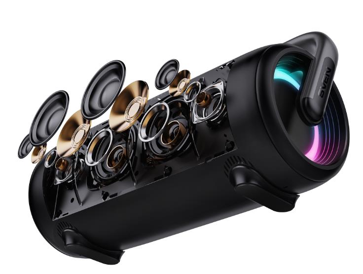 Габариты у SVEN PS-395 довольно внушительные — 390×200×145 мм, да и масса не маленькая — 3,1 кг. Это дало возможность сделать ее по-настоящему громкой, общая мощность достигла внушительных 80 (2×40) Вт, что позволяет ей озвучить не только дружескую встречу дома, но и просторную открытую площадку. При этом благодаря технологии TWS можно объединить две PS-395 в стереопару, удвоив громкость и объем звучания.
