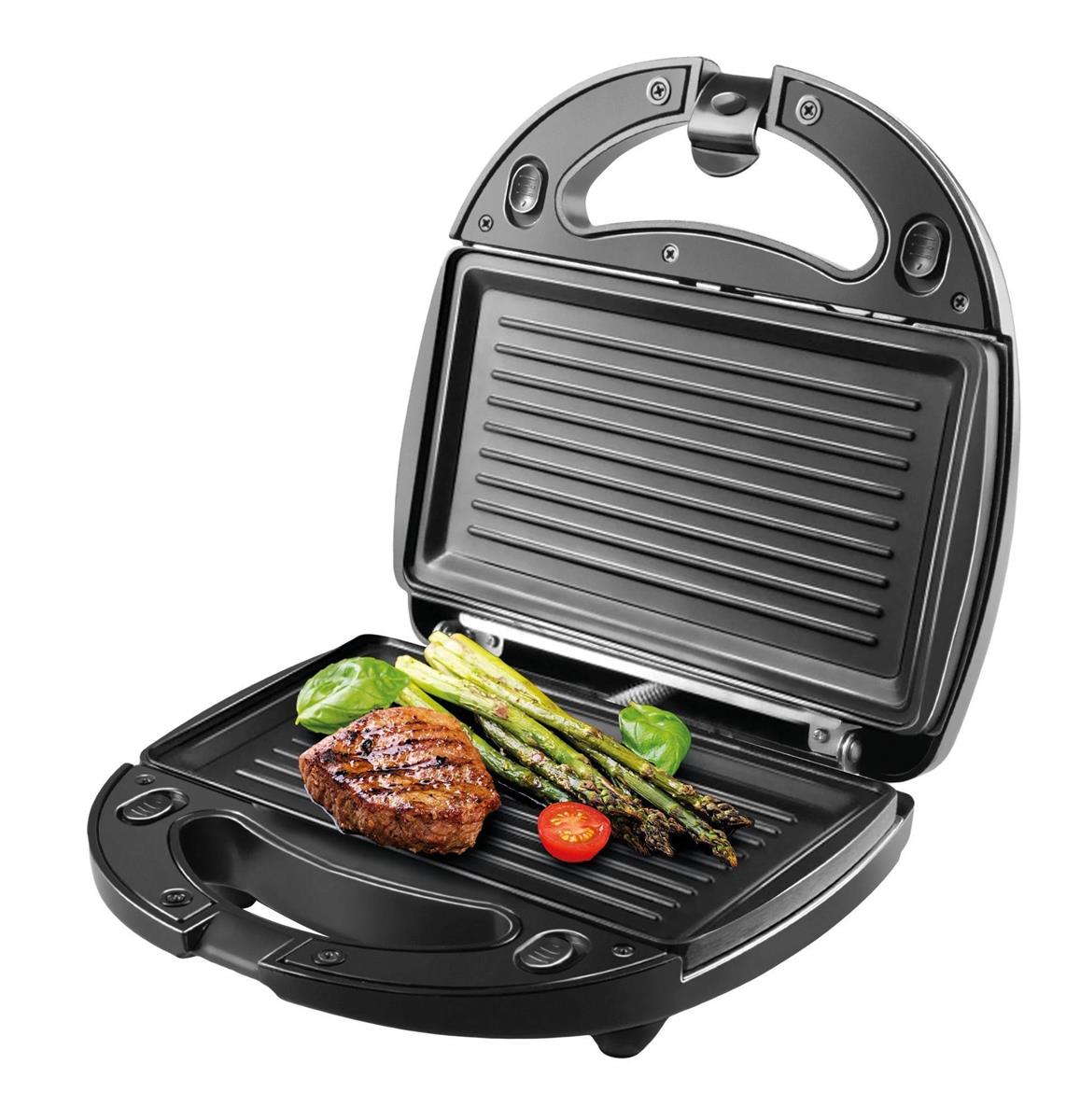 ногофункциональное устройство Eurostek EWM-818, съемные панели: сэндвичи, панини-гриль, мощность 800Вт, хромированная отделка панели, быстрый нагрев, легкая очистка, не нагревающаяся ручка, автозамок, легкая смена форм, регулировка температуры.