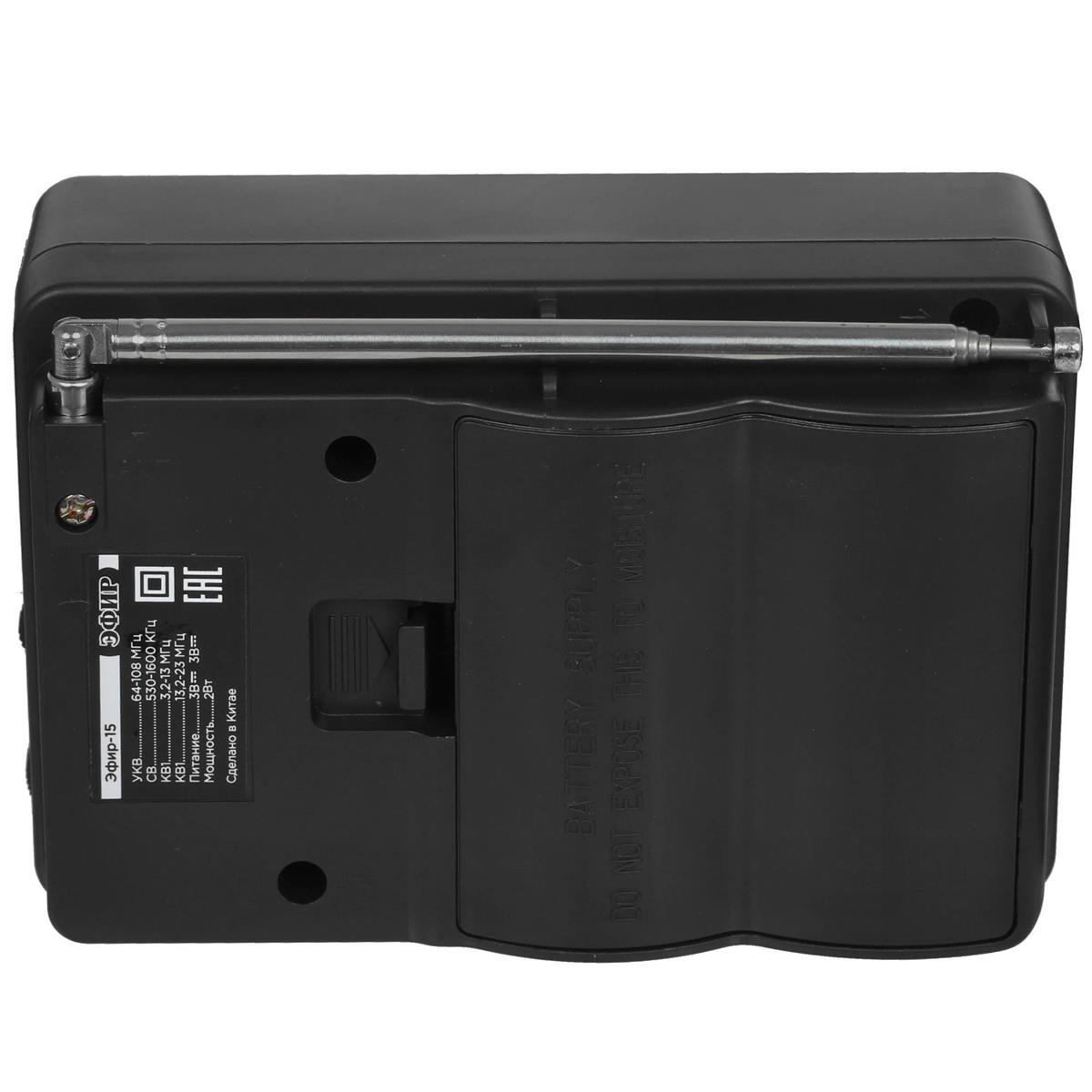 Радиоприемник ЭФИР 15, УКВ 64-108МГц, СВ 530-1600КГц, КВ1,КВ2 бат. 2*R20(D) черный