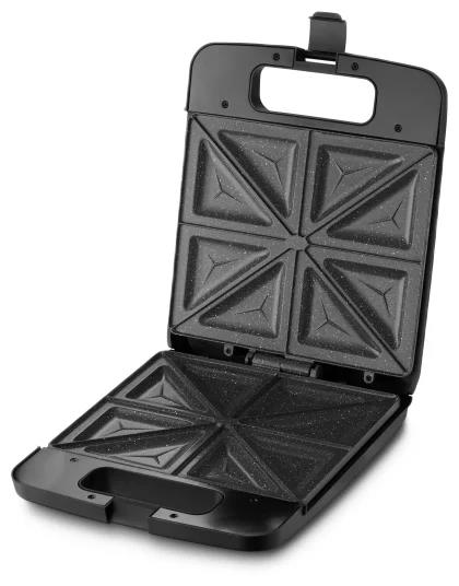 Сэндвич-тостер Zelmer ZSM7400 черного цвета отличается вместительностью и сможет приготовить одновременно четыре бутерброда, разделенных на треугольные части. Устройство оснащено съемными каменными пластинами с антипригарными свойствами, что значительно упрощает процесс ухода и очищения после приготовления пищи. Корпус модели выполнен из ненагревающегося пластика, что позволяет размещать ее на любых поверхностях. Сэндвич-тостер Zelmer ZSM7400 общей мощностью 1440 Вт достаточно компактен. Предусмотрено удобное хранение шнура на корпусе изделия, общая длина которого 1,2 м. Крышка прибора открывается на 180 градусов и имеет фиксатор. На корпусе также есть световая индикация включения, нагрева и готовности к работе. Нескользящая основа предотвращает случайное падение и обеспечивает дополнительную безопасность при использовании. Изделие легко хранить даже в небольших помещениях — возможно вертикальное размещение.