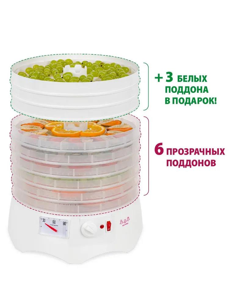 Сушилка для овощей Мастерица EFD-0903VM 6 прозрачных поддонов + 3 белых поддона в подарок, D 31,6,см (поддонов 6 шт, 280 Вт , белый)