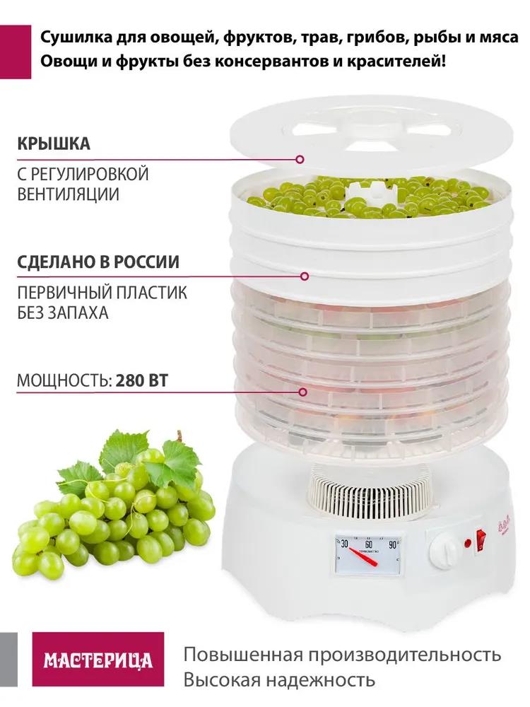 Сушилка для овощей и фруктов Мастерица 6 прозрачных поддонов + 3 белых поддона в подарок. Конвекционная электросушилка имеет прочный биметаллический термометр, который безошибочно показывает температуру сушки, а это очень Важно для бережной сушки, когда Вы видите реальную температуру внутри дегидратора. Аналогичного термометра Вы не встретите в комплектации других сушилок. Сушилка для овощей и фруктов Мастерица EFD-0903VM, имеет индикацию включения прибора, бокс для хранения электрошнура, электрошнур сушилки армирован вилкой с заземлением, клапаном регулировки потока воздуха. Лотки снабжены клапанами центрального отверстия, для равномерного распределения потока воздуха между лотками. Изготовлена из пластика с высоким тепловым сопротивлением, что сокращает время сушки.