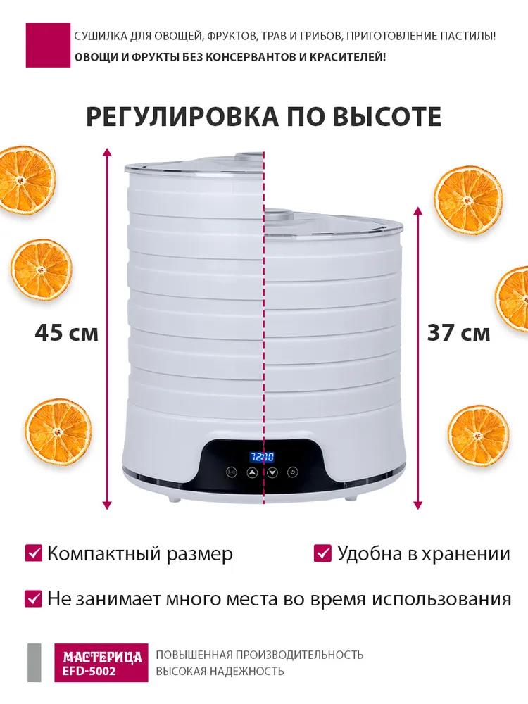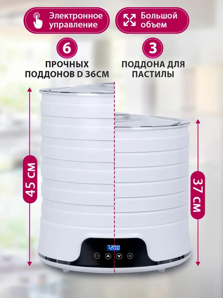 Сушилка для овощей Мастерица EFD-5002, 6 бел. поддонов + 3 поддона д/пастилы 500Вт, увелич. D поддона 36 см (поддонов 6 шт, 500 Вт , белый)
