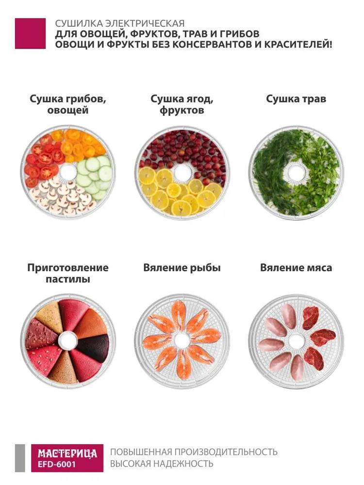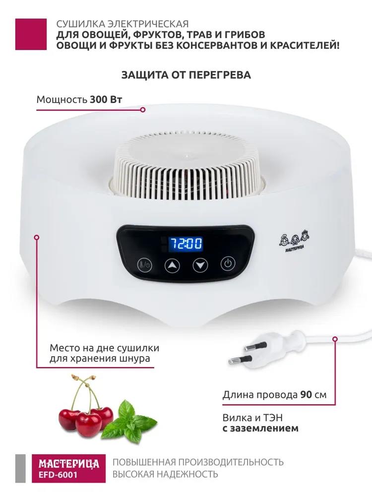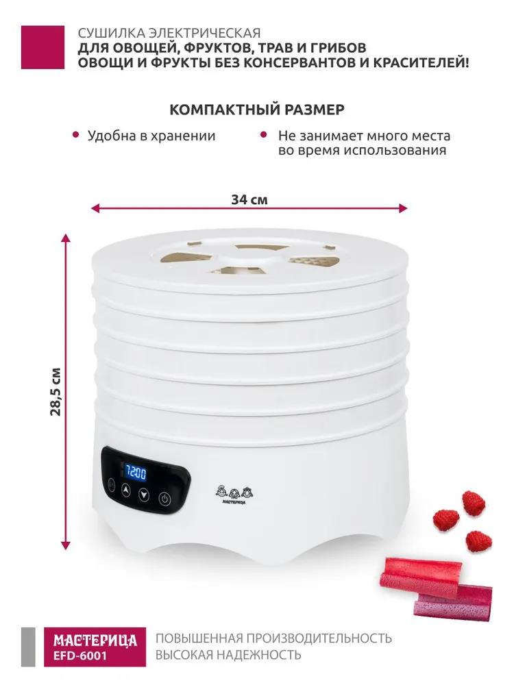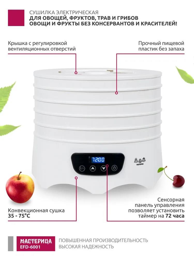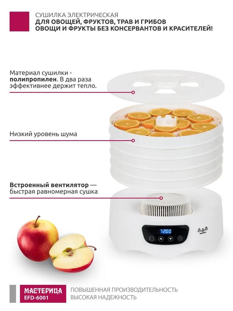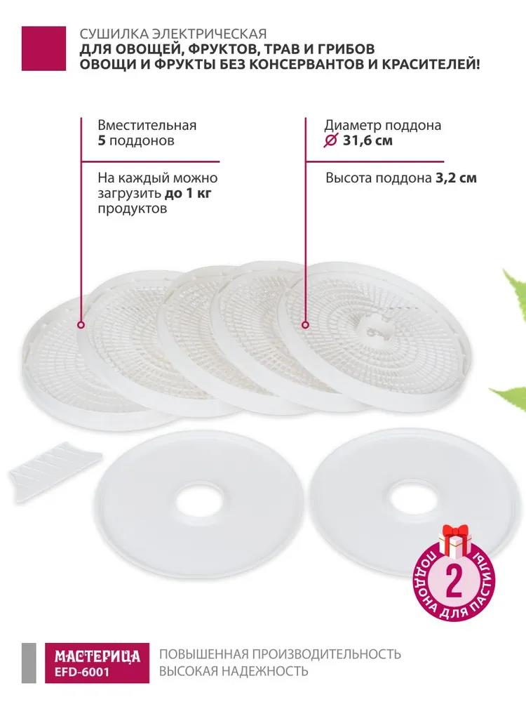 Сушилка для овощей Мастерица EFD-6001, 5 белых поддонов + 2 поддона д/пастилы 300Вт, D 31.6 см (поддонов 5 шт, 300 Вт , белый) - Интернет-магазин Матрица: бытовая техника, электроника, товары для дома и др.