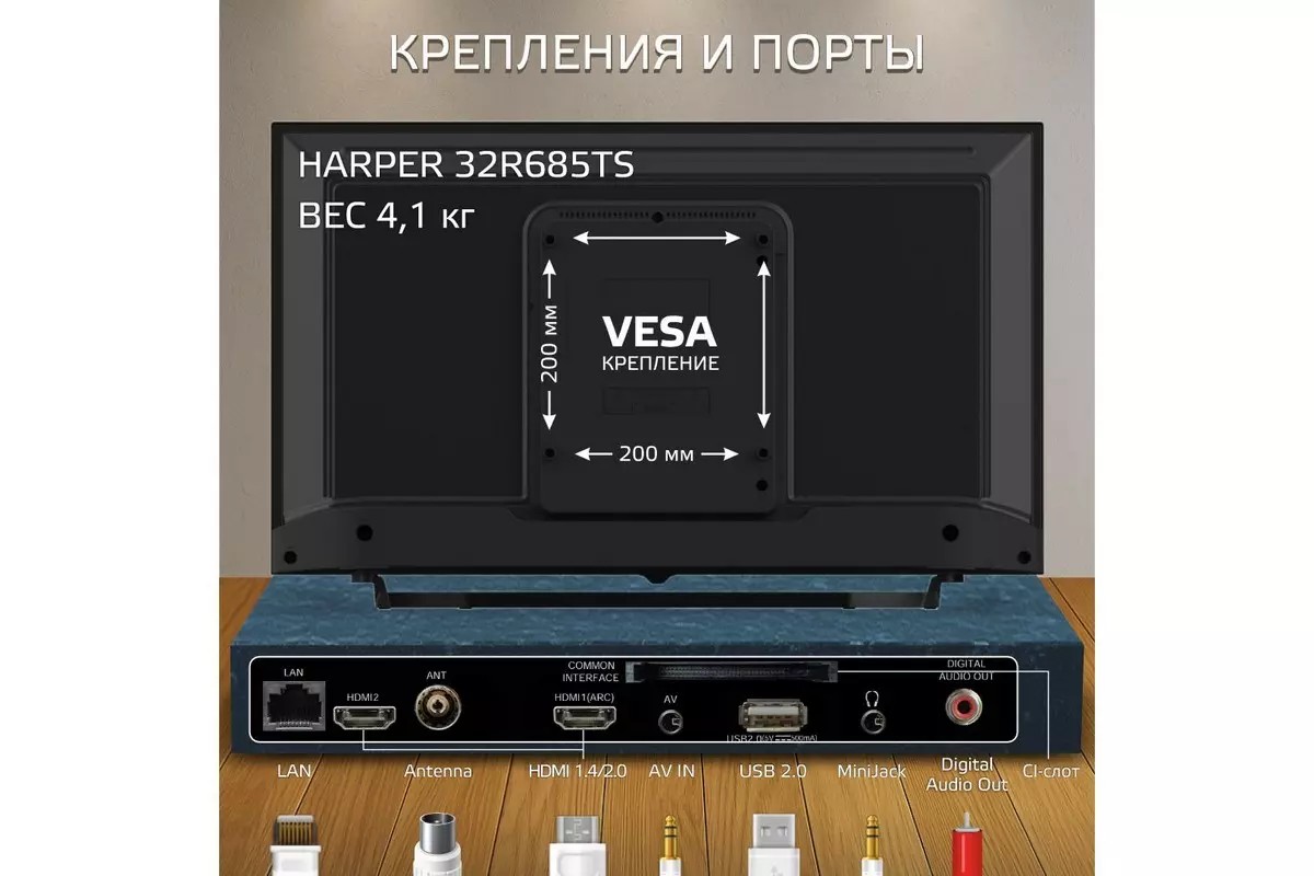 Новинка Harper 32R685TS – это хорошо сбалансированный, достаточно производительный SMART телевизор с большими возможностями. Вам будут доступны: высокая чёткость картинки с HD-разрешением, стереозвук (2 встроенных динамика по 6 Вт), встроенный медиаплеер с поддержкой исчерпывающего перечня современных кодеков, проводное и беспроводное подключение к сети Интернет, все необходимые порты для взаимодействия с другими внешними устройствами, понятный интерфейс на базе ОС Sber.