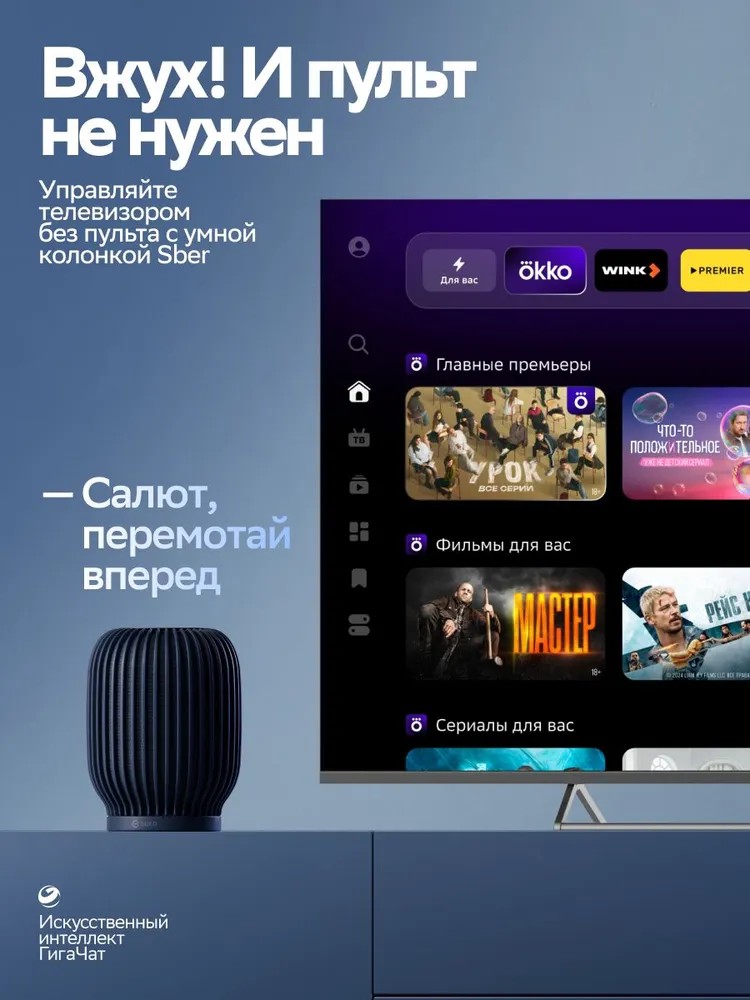 Умный безрамочный телевизор Sber из новой коллекции на стильном моностенде. Яркий и чёткий UHD-экран с технологией QLED и диагональю 65″. Также есть двухдиапазонный Wi-Fi, улучшенный звук и увеличенная оперативная память.