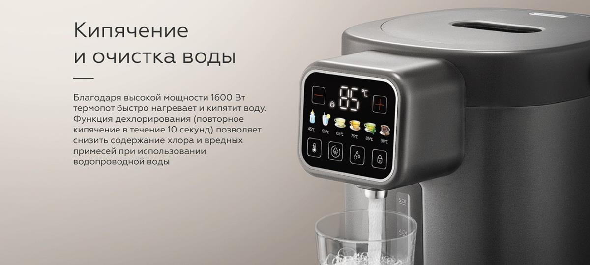 Откройте для себя удобство и функциональность термопота BQ TP5000 с емкостью 5 литров, который станет незаменимым помощником в вашем доме или офисе. С мощностью 1600 Вт он быстро нагревает и кипятит 5 литров воды. Сенсорный LED-дисплей дает возможность легко управлять настройками термопота, в том числе включить режим поддержания температуры, повторное кипячение или очистить воду с функцией дехлорирования, позволяющей снизить содержание хлора и вредных примесей при использовании водопроводной воды.