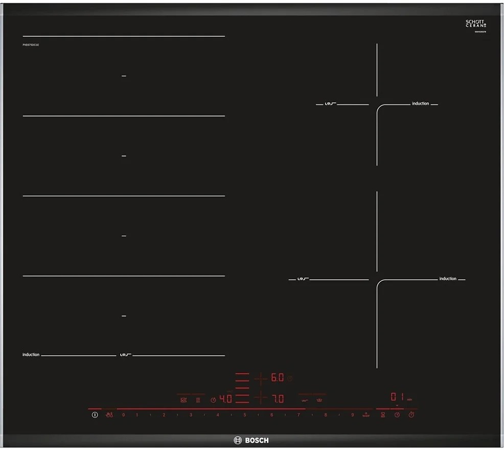 Индукционная встраиваемая варочная панель Bosch PXE675DC1E сделана из стеклокерамики и имеет независимое управление. Сенсорное поле DirectSelect расположено в нижней части, по бокам — две полосы нержавеющей стали. Вверху и внизу панель имеет скошенный профиль для более аккуратной установки, плотного прилегания и хорошей очистки. Зоны индукции размечены, подсвечиваются в процессе работы. Есть возможность блокировки сенсоров во избежание случайного включения детьми.