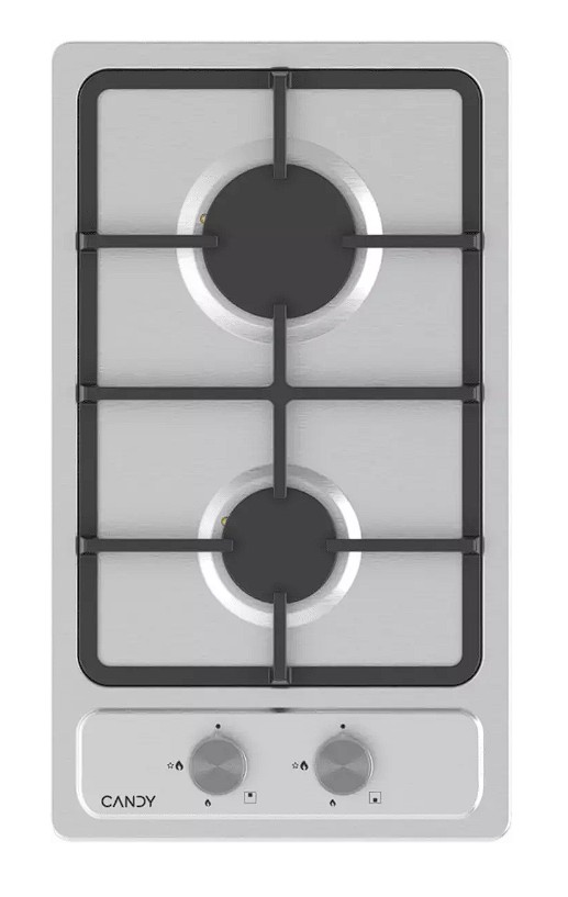 Candy CHXM32CX — это компактная встраиваемая газовая варочная панель типа «домино» шириной около 30 см, выполненная из нержавеющей стали. Модель оснащена двумя конфорками разной мощности и чугунной решеткой для устойчивости посуды.