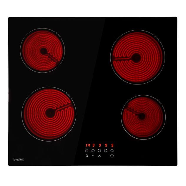 Электрическая варочная панель с 4 конфорками – это идеальная плита для семьи из 3-4 человек. Ширина встраивания – 60 см. Лаконичный дизайн и доступная функциональность – достоинства варочных панелей Evelux.