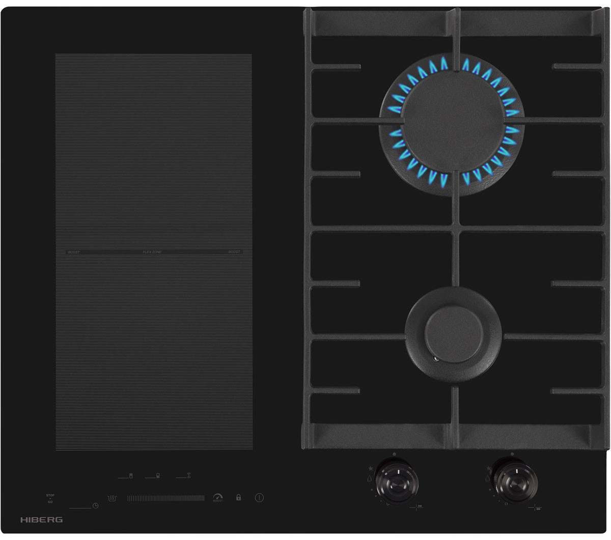 Комбинированная варочная поверхность HIBERG i-VM 6021 B выполнена из стеклокерамики черного цвета и оснащена 2 газовыми конфорками и 2 индукционными с возможностью объединения зон. Материал рабочей поверхности – стеклокерамика, которая не только имеет красивый зеркальный вид, но и обеспечивает устойчивость к воздействию высоких температур, легка в уходе и способна выдержать тяжелую посуду. Главная особенность модели – индукционные конфорки, которые благодаря функции Flex Zone могут объединяться в одну.