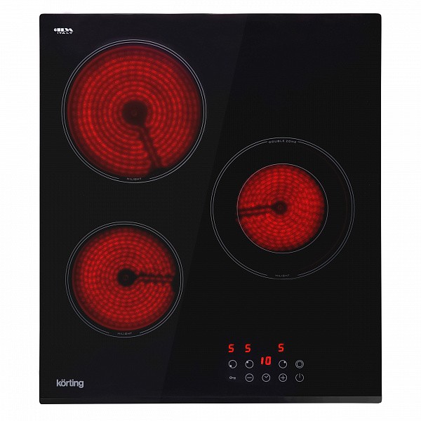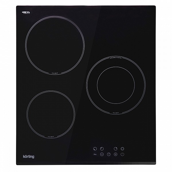 Korting HK 42034 B — это компактная встраиваемая электрическая варочная панель шириной 45 см, выполненная из черной стеклокерамики. Она оснащена тремя конфорками быстрого нагрева HiLight, одна из которых имеет двухконтурную зону расширения для посуды разного диаметра.